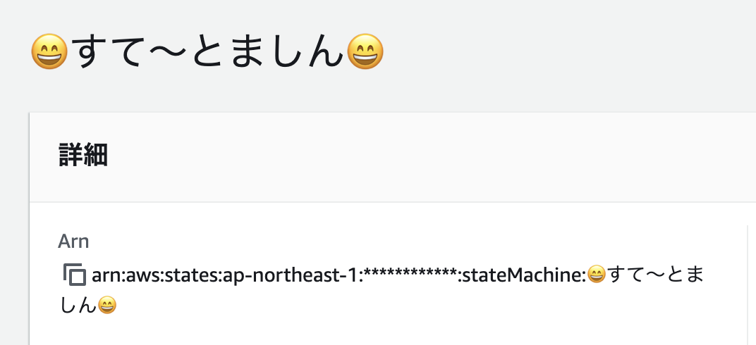 Step FunctionsのARNはステートマシン名を元に組み立てられるので、ステートマシン名に日本語文字を入れるとARNにも同様に日本語文字が入ることになります。