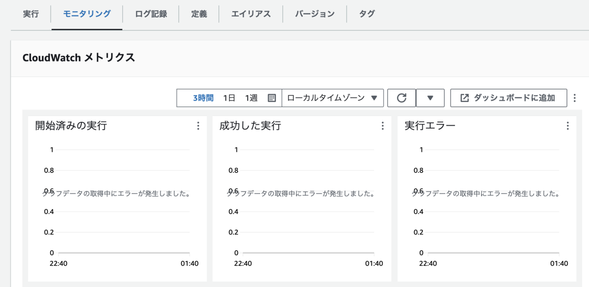 また、非ASCII文字を使う弊害として、このステートマシンについてCloudWatchによる監視ができなくなる旨が書かれています。コンソールでモニタリングタブを開いても、以下のようにエラーが表示されグラフが閲覧できません: